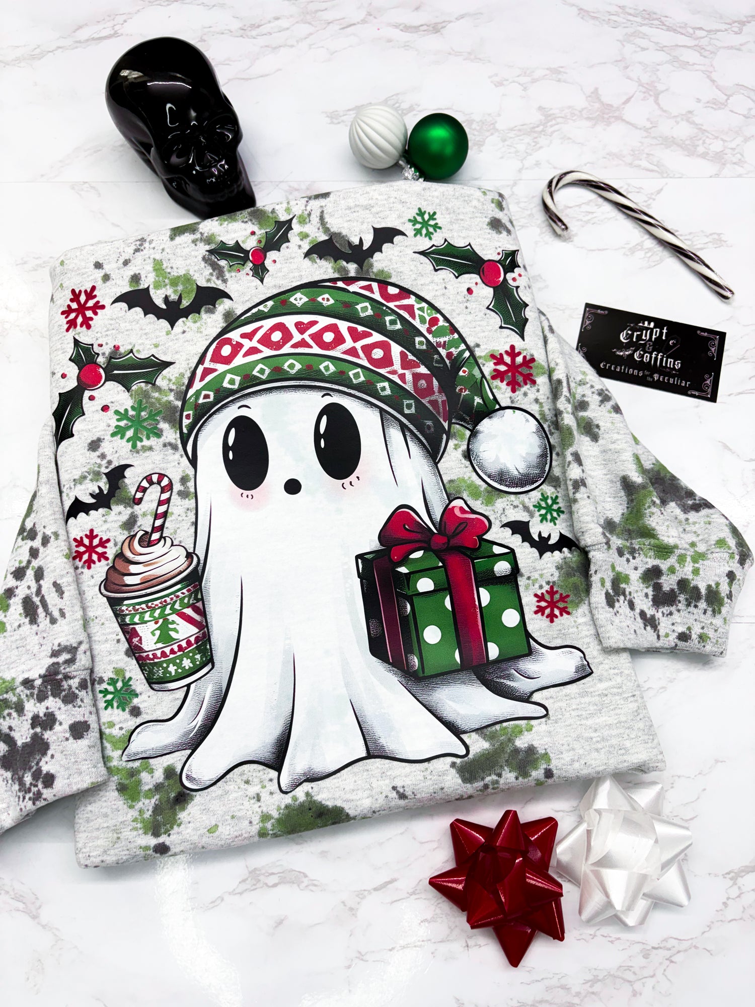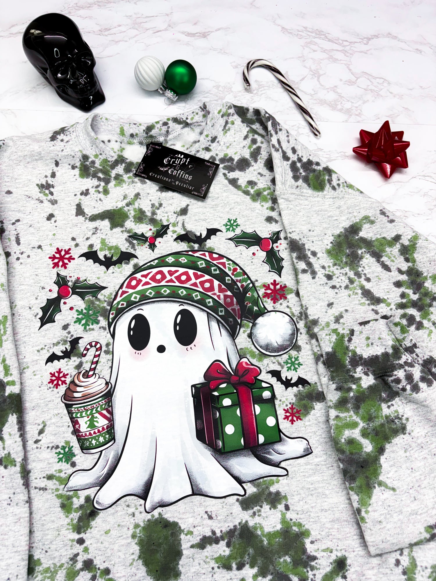 The perfect cozy, Creepmas sweater! Shades of green + coal speckled on an ash sweater! Entirely Hand dyed! Using Premium Quality Screen Printed Ink + Hand pressed. When you're dead inside, but it's Creepmas time! Ideal for cozy, everyday lounge wear.